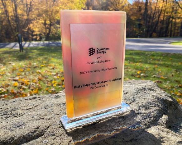 Our Rocky Ridge Neighborhood Association, with its signature, charitable initiative of making and selling Mill Creek Maple Syrup, was recognized for making a difference in our community. Dominion Energy and Cleveland Magazine awarded us their 2017 Community Impact Award. A group of representatives received the honor at a special ceremony on March 10, 2018. Many residents volunteer countless hours toward this project year after year. It’s a great example of how friendly neighbors can do great things together.